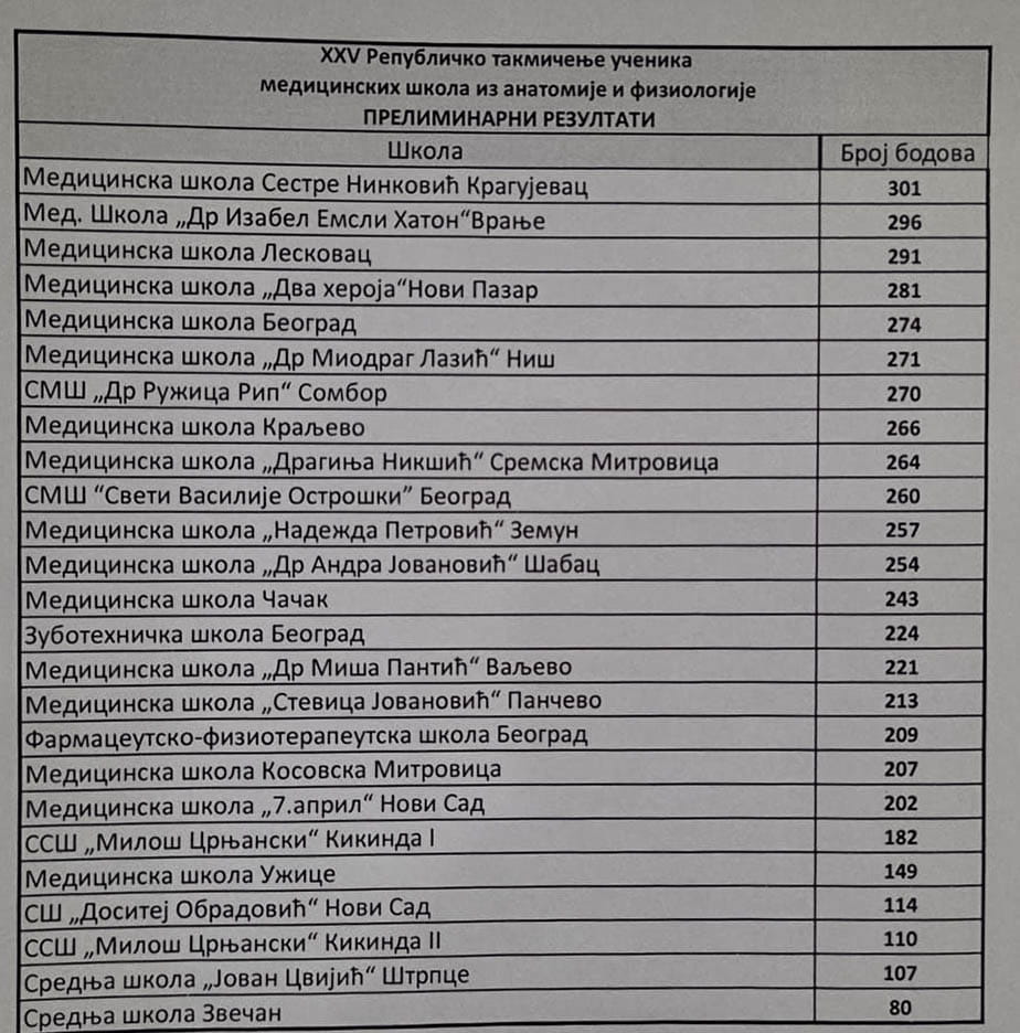 Na Republičkom takmičenju iz anatomije i fiziologije održanom 17.04.2026. godine u Banji Koviljači, ekipa Medicinske škole “Dva heroja” u sastavu Fatima Kadrić, Amra Jahović i Adem Košuta predvođeni mentorkom dr Elvirom Redžepović i profesoricom Samrom Ljajić osvojili su zavidno IV mesto. Na takmičenju su učestvovale ekipe iz ukupno 25 medicinskih škola iz cele Srbije.